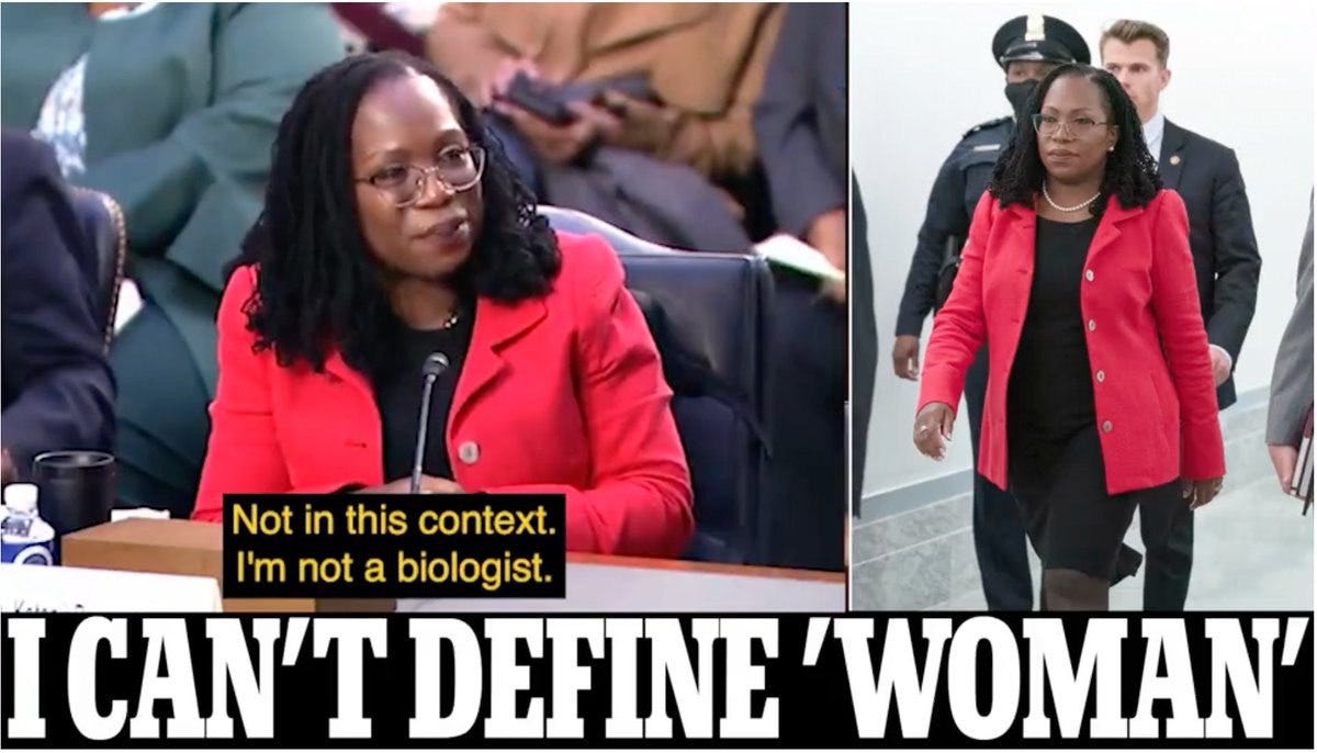 US Supreme Court nominee Ketanji Onyika Brown Jackson being asked by a Republican Senator to define “woman” and replying she was not a biologist is a marker moment for modern weirdness. As James Lindsay comments, she needed an expert to state the truth of her own being.