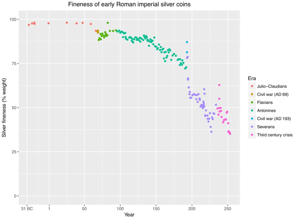 The authors also do not seem to be aware that the collapse in Roman silver production predates the rise of the House of Sassan, as they claim (p.85) that increased military expenditure meant there was not enough silver for the needed coins, leading to their debasement. Indeed, the collapse in Roman silver production helps explain the rise of the Sassanids.