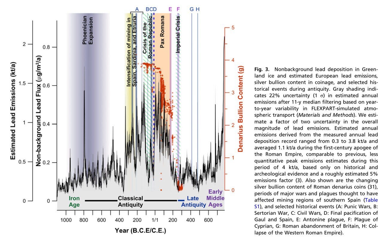 J.R. McConnell, A.I. Wilson, A. Stohl, M.M. Arienzo, N.J. Chellman, S. Eckhardt, E.M. Thompson, A.M. Pollard, J.P. Steffensen, ‘Lead pollution recorded in Greenland ice indicates European emissions tracked plagues, wars, and imperial expansion during antiquity,’ Proceedings of the National Academy of Science (PNAS) USA, 2018, May 29; 115(22): 5726-5731. https://www.pnas.org/doi/10.1073/pnas.1721818115