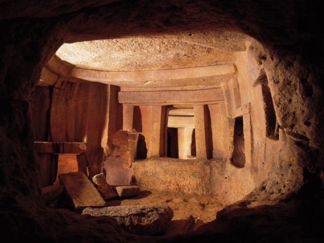 This (below) was built 5,000 years ago (for a long time, it was considered the oldest free-standing stone structure on earth, until an even older one was unearthed in Eastern Turkey). Called the Hypogeum, it is one of the oddest places I have ever visited, made odder because no-one really knows what it was for, except that when it was discovered it was full of human remains, painted red-ochre swirls, and statuettes of extremely plump women (called, imaginatively, “Fat Ladies” by the locals).