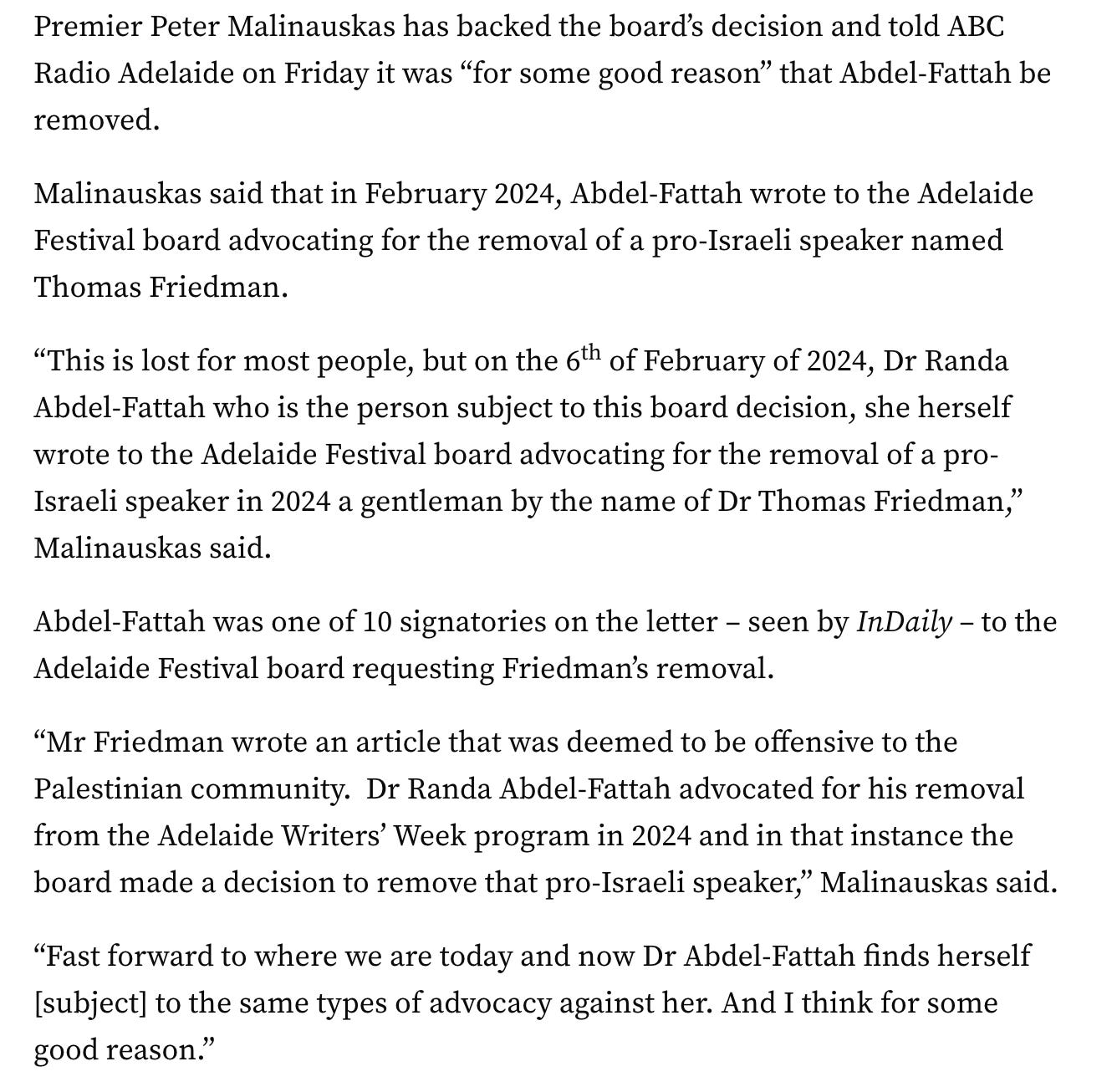 Peter Malinauskas, the South Australian Premier (equivalent of a US governor or—roughly—Scotland’s First Minister), has therefore come out playing hardball, both against Abdel-Fattah and Australian literary culture more widely.