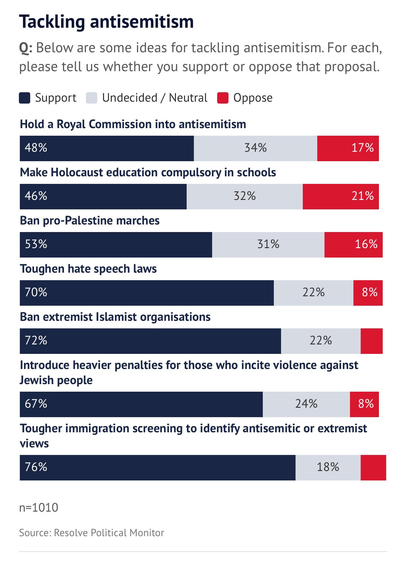The Australian electorate’s Eye of Sauron1 turned on both Islamism and Palestinian activism the way it had previously focussed on Jewish activism. The poll below—undertaken shortly after the massacre—indicates the consequences. Positions have only hardened since then. Until Bondi, Australia’s cheerful, smiley PM, Anthony Albanese, had been genuinely popular. Now—while people still like the Australian Labor Party—Albanese’s personal approval ratings are in the toilet.