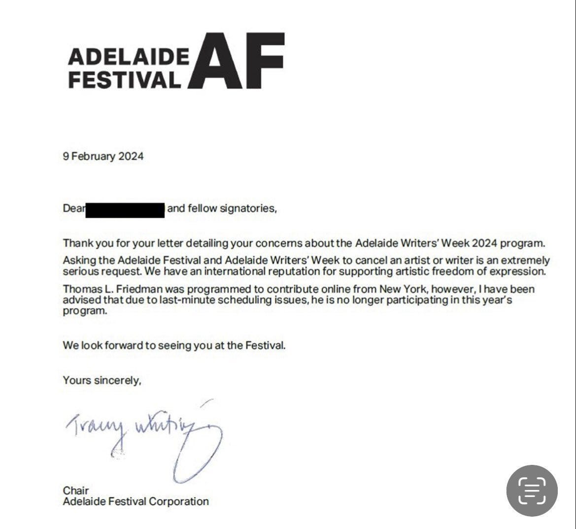People who don’t like my even-handedness on this issue are reminded that Google is their friend. For those unwilling to let their fingers do the walking, I was subjected to a Jewish-lobby instigated cancellation campaign over my first novel. One of its leaders was Louise Adler, current director of Adelaide Writers’ Week (she has now changed sides on the issue, as you will have noted).